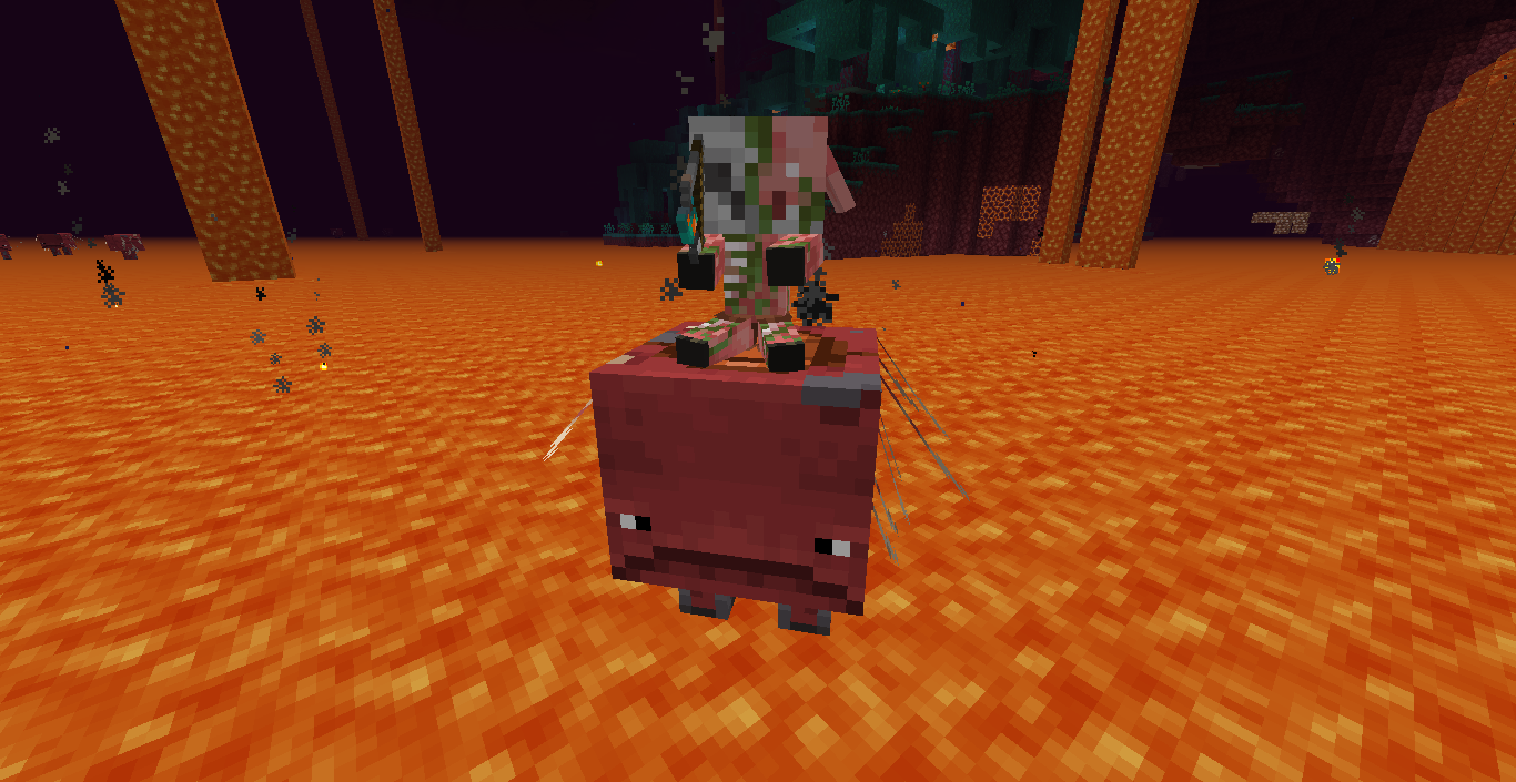 A baby zombified piglin has a chance of spawning as a chicken jockey in Java Edition. An adult zombified piglin can also spawn riding a Strider above lava, holding a warped fungus on a stick.