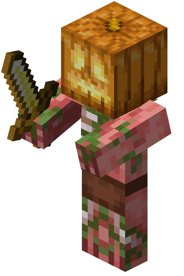 On Halloween (October 31), zombified piglins have a 22.5% chance of spawning with a carved pumpkin or a 2.5% chance of spawning with a jack o'lantern equipped as headgear.[JE only]