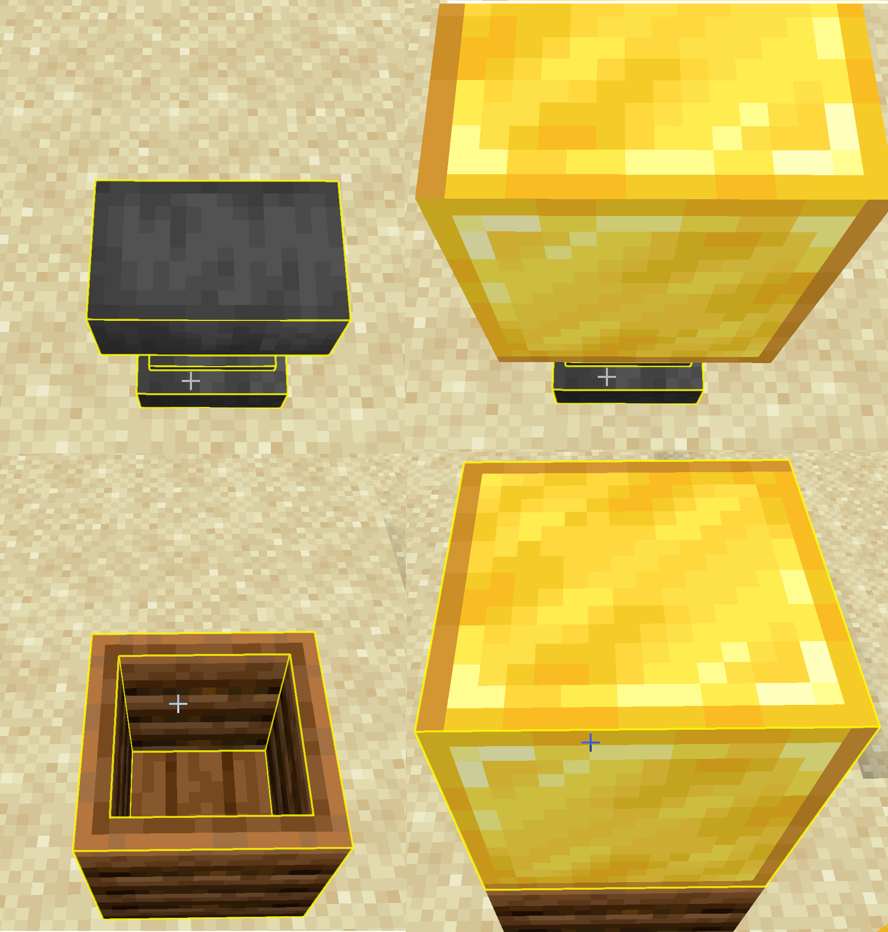 - 漏斗:漏斗的互動箱與方塊狀態有關。當漏斗指向下方,互動箱為漏斗內部的空間;當漏斗指向某一個水平方向,互動箱位於對應漏斗方向上,覆蓋漏斗的指向部分。