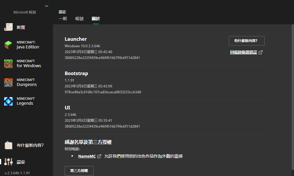 | Minecraft啟動器與Minecraft Dungeons啟動器版本 | |||||||||||||||||||||||||||||||
