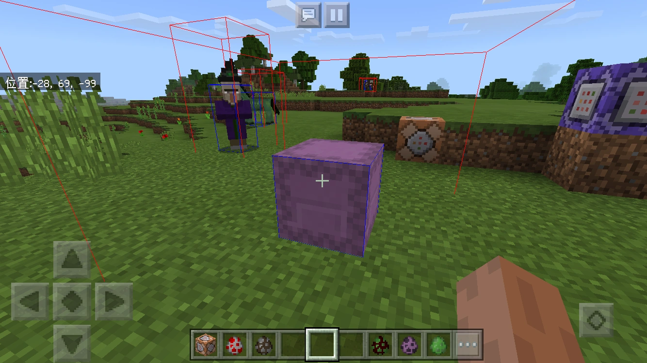 执行后在所有实体周围生成一个蓝色方框和一个红色方框,蓝色部分的大小代表碰撞箱大小,红色部分的大小代表玩家与该实体有效碰撞距离。