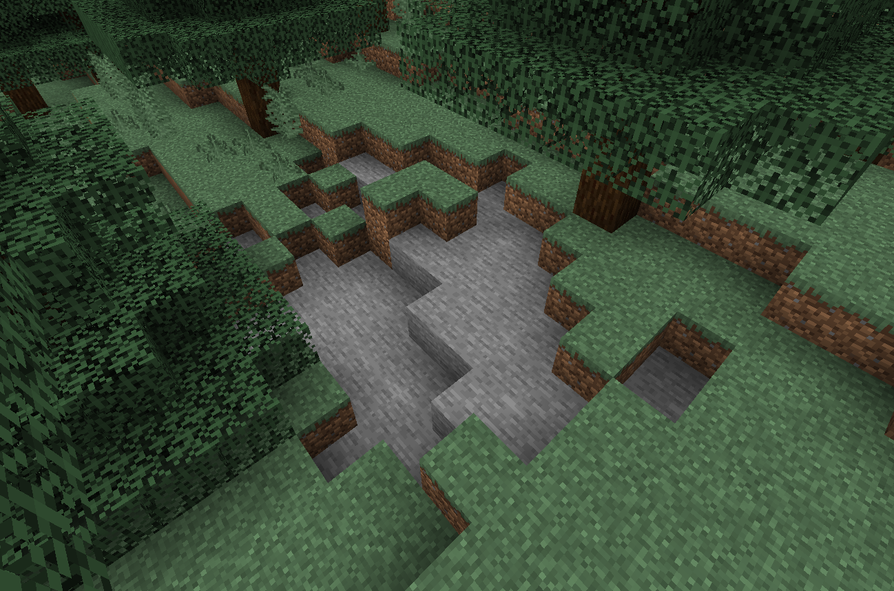 空洞(Hollow)与浮岛相反。它们看起来像洞穴,但与洞穴生成无关(尽管它们可能与洞穴交叉)。当有许多悬崖时,它们会靠在一起并创造出一个空洞。它们的高度与地形一致,这取决于它们所在的生物群系,而不像洞穴那样。洞穴没有特定的高度。草方块可以在空洞内生成,有趣的是它们可以在没有光的情况下生成。当空洞生成在低于海平面的高度上时,它们会被水填充。空洞在主世界中非常罕见,但在自定义世界中很常见。