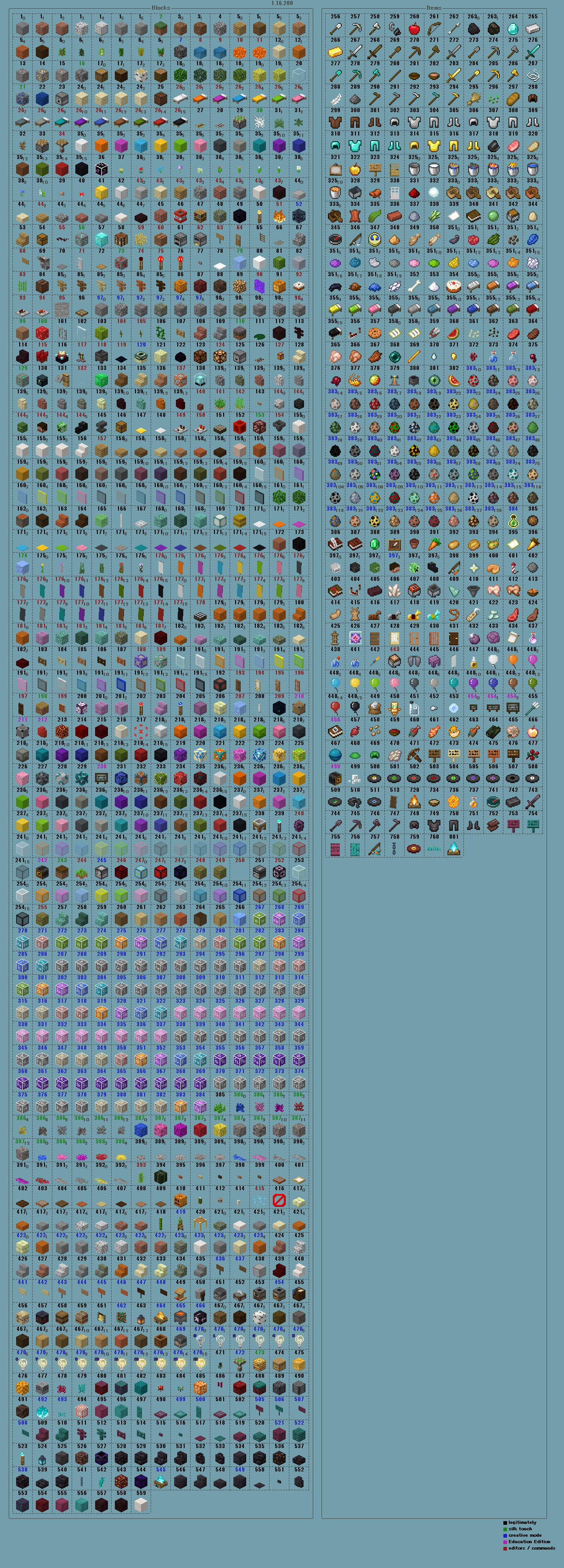 数据值(Data Values)决定了基岩版内不同种类的方块和物品。它们在Minecraft中有很多用处。方块ID用于定义放置在世界的方块和物品栏内的物品(包括箱子里的和作为掉落物的)。物品ID只对物品有效。实体ID只对例如生物和弹射物的实体有效。方块数据进一步定义世界中的方块,例如指定水的高度或火把指向的方向。这些数据与Java版大相径庭。