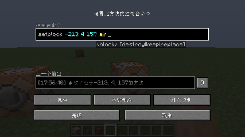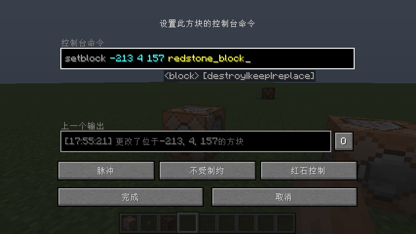 可以使用/setblock命令实现无线红石输出。图中命令的坐标需要根据实际情况更改。