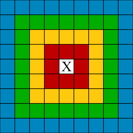 以下是一幅顯示苦力怕爆炸傷害可能性的圖片。中央有著「X」的白色區域是苦力怕的位置。這個網格以方塊代表距離,並表示出了玩家身處每一格的危險性。請注意,你可能認為自己離它有2個方塊,但實際上這個距離會更近。這與你的顯示卡和視角(比如仰視和平視)有關。