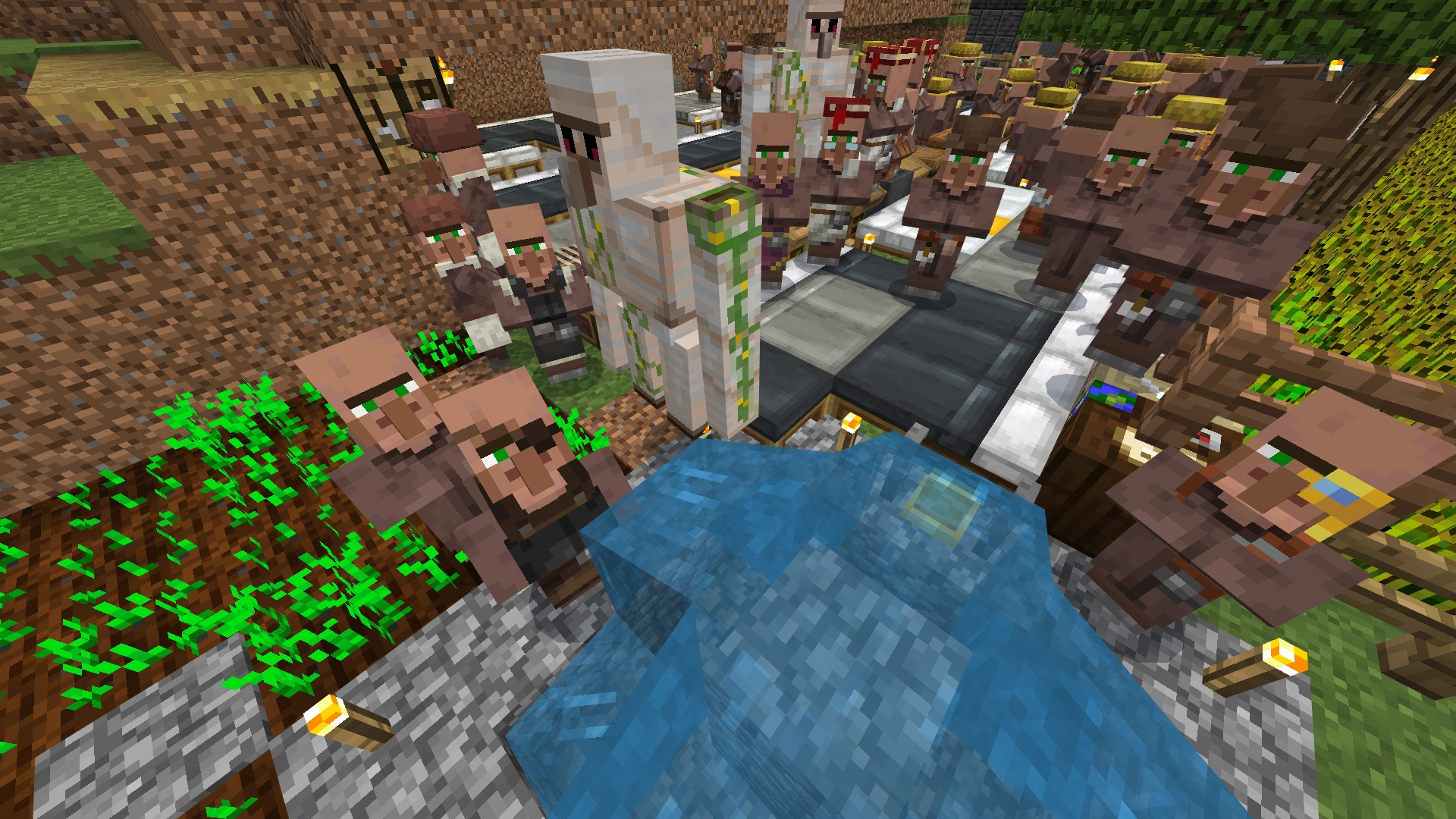 - 尽可能把村民全部推入坑内(至少两个,但一般地越多越好),推下去后用易获得的泥土或木台阶封顶(但要记得用之前收集到的火把添加照明)。