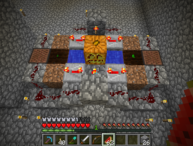 在这种情况下,侦测器将会判定梗而不是果实。这使农场更小更紧凑因为不再需要一个机制来停止由于侦测器侦测到活塞臂而一次又一次地不断触发的循环。这个农场每分钟生产12-13个瓜。
