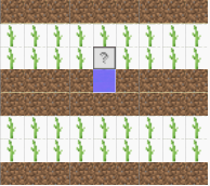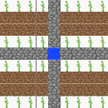以上大部分农场皆可平铺成为大型农场,即使在一些情况下,间隔播种或按列分布都能取得最佳的种植效果。该农场是方案A的扩展(侧向翻转),左侧的图表反转。(这也显示了整个农场的耕地边界。)其分布可以进一步重复,以9×9为单位把农场扩大。注意这个设计的目的是确保每个果实只占一个梗——当它的成熟时,效率会接近49%。