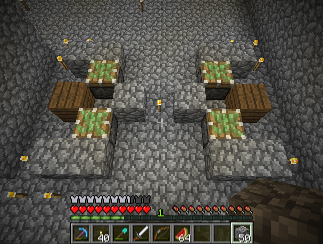 当上述的设计都使用一层时,效率最高的(49.38%)9×9的农场都可以建造成双层。这个设计是基于方案D,且圆石代表将被覆盖(用泥土)的上面一层的空间。