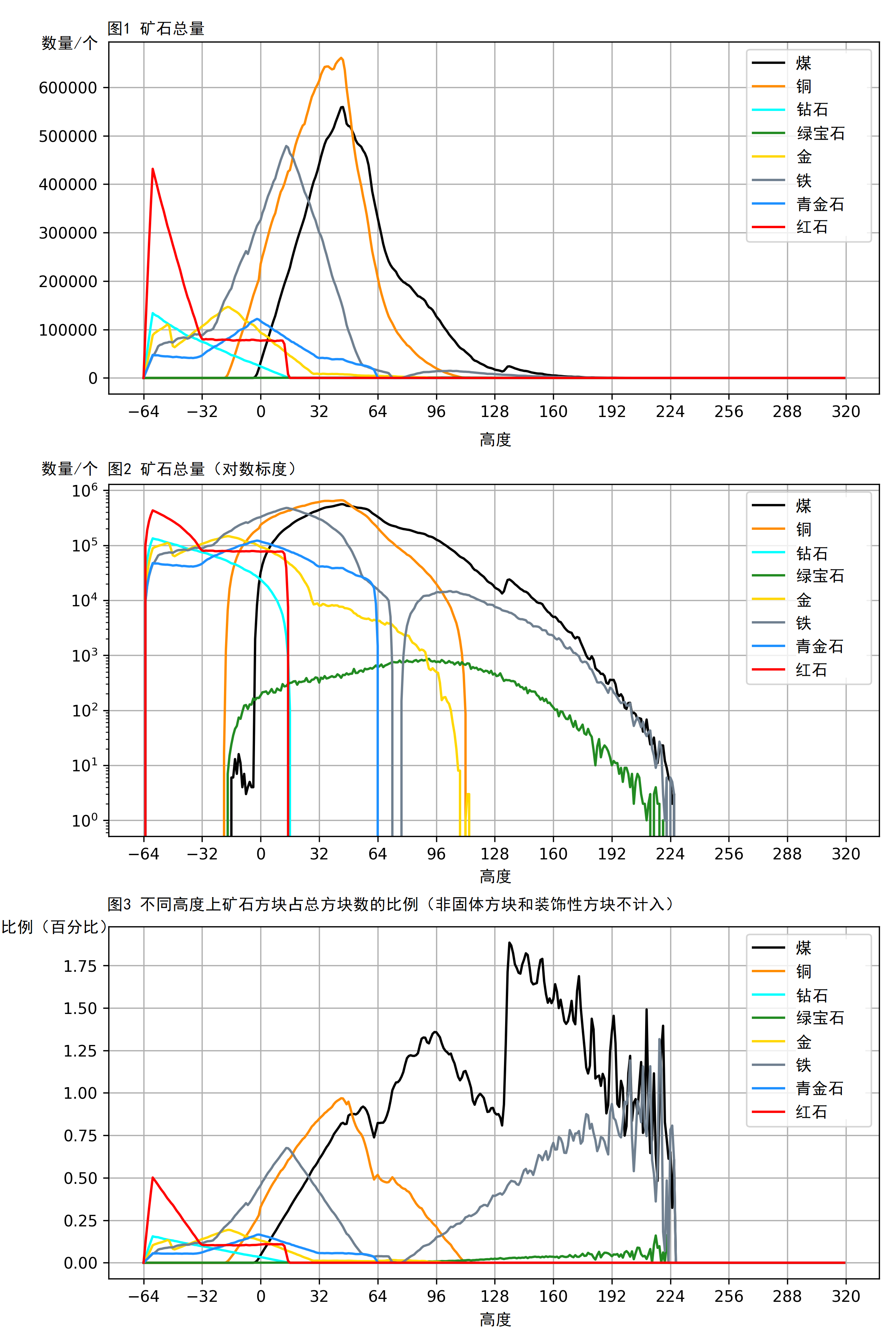另一组主世界的矿石分布图,通过扫描五十万个区块得到。注意,不建议以此图片中较高高度的数据为参考依据