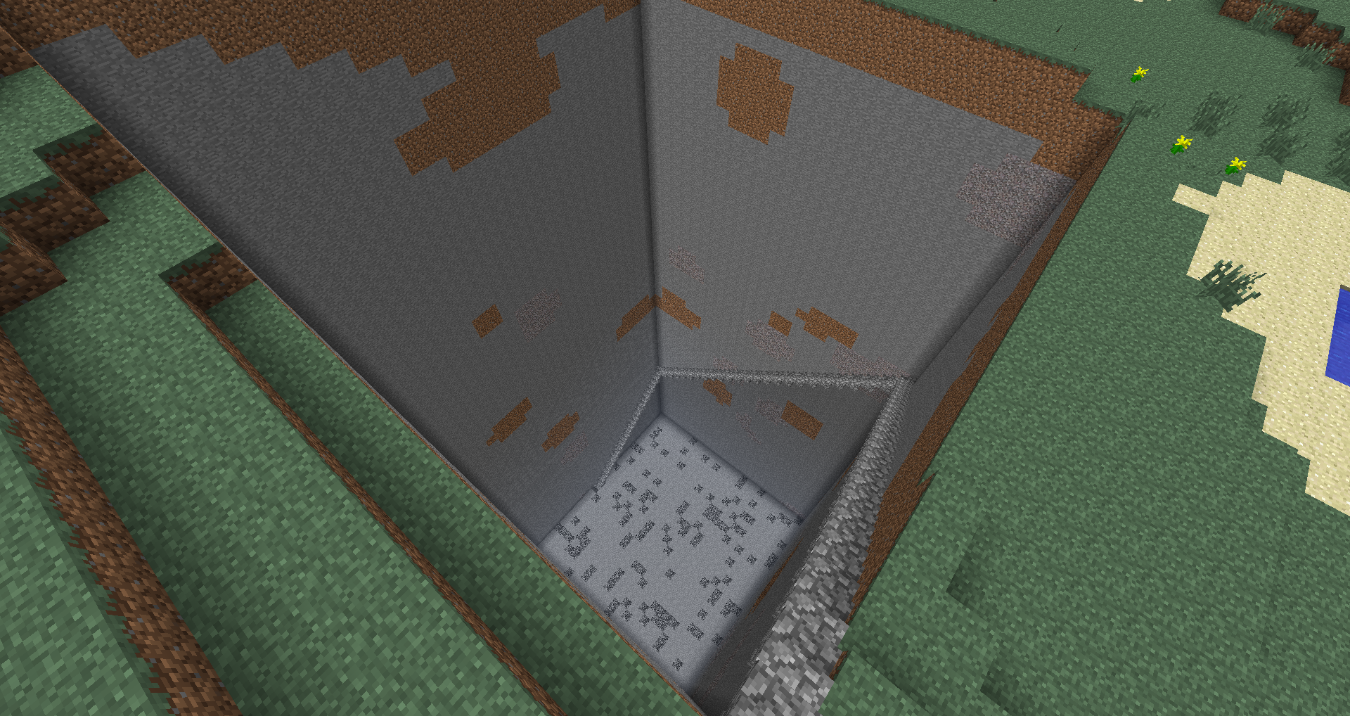 这涉及到基本采石技术,但在较小的正方形范围内。首先,你需要决定你的矿区要有多大。举例来说,我会用2×2大小的采石场,所以我会制造3×3的洞,然后走过1个方块,并重复。这样可以最大限度地找到矿石。但你至少需要3×3大小的,一直挖到基岩。警告:这可能非常危险,因为你可能进入隐蔽的洞穴、地牢、熔岩池和废弃矿井。