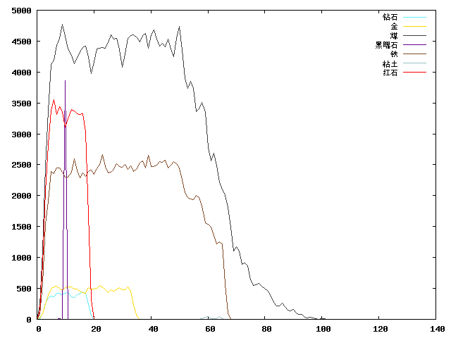 | 金 | 33层及以下,29层及以下更常见。在恶地生物群系,也可在32至79层生成。 |