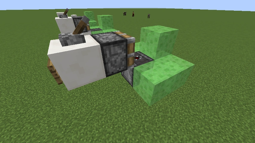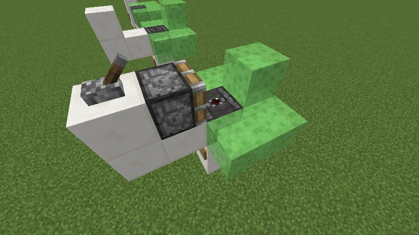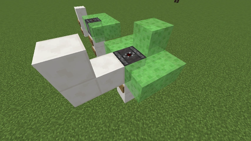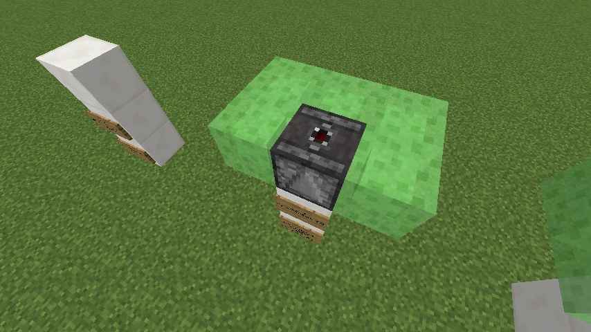 如图所示,将支架的最上面一个换成侦测器。注意,侦测器输出红石信号一侧朝上。 然后将黏液块围绕侦测器放置(如图所示)。