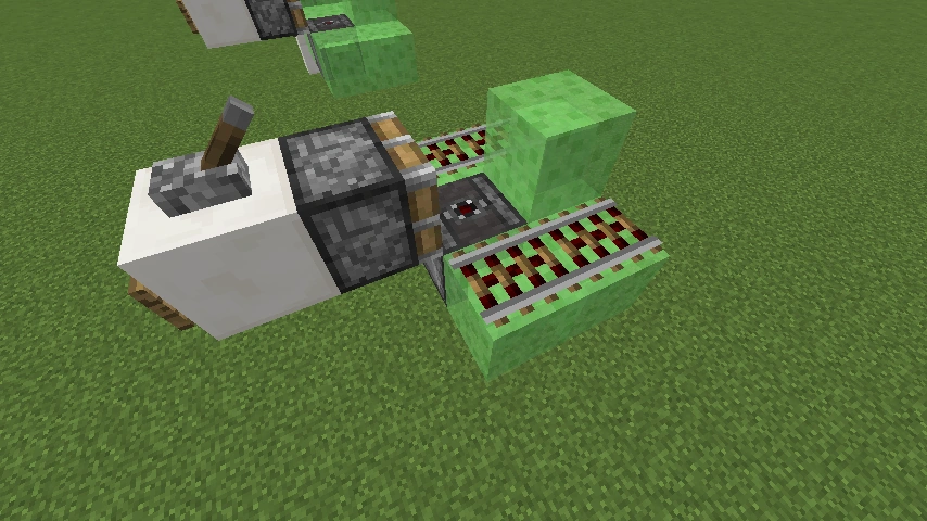 图中若上面的活塞伸出,钻石块会在铁轨之前被黏液块覆盖;若下面的活塞伸出,铁轨会先被覆盖。刷铁轨机应使用上面的活塞。 也有两种开始复制前便撤去支撑且不更新铁轨,使铁轨成为BUD的方法。一种是将铁轨放在活板门上,然后激活活板门,注意不要让信号源在更新活板门后更新铁轨。另一种如下图。