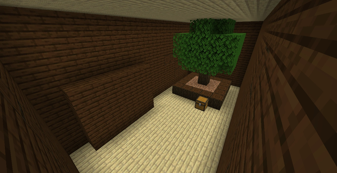 一个房间里有一棵树和一个箱子,里面有一把带有效率I附魔的铁斧。这个房间的入口由木板墙封闭。 | 105 白桦木板,