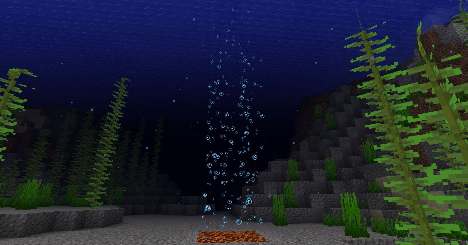 当世界生成时,峡谷和水下遗迹会生成在水面以下。当熔岩出现在那里时,一些熔岩会转变成黑曜石,另一些会转变成产生气泡柱的岩浆块。