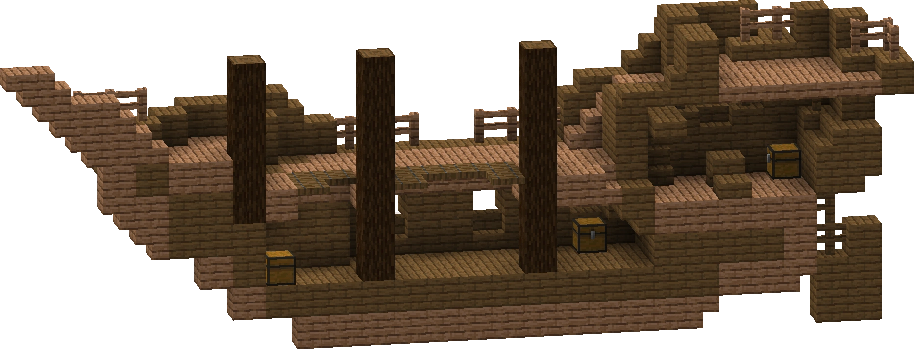 | with_mast | 所有沉船中船体最完整的一个结构。船体直立,有着3个桅杆。 | 67 橡木原木 209 橡木木板 |