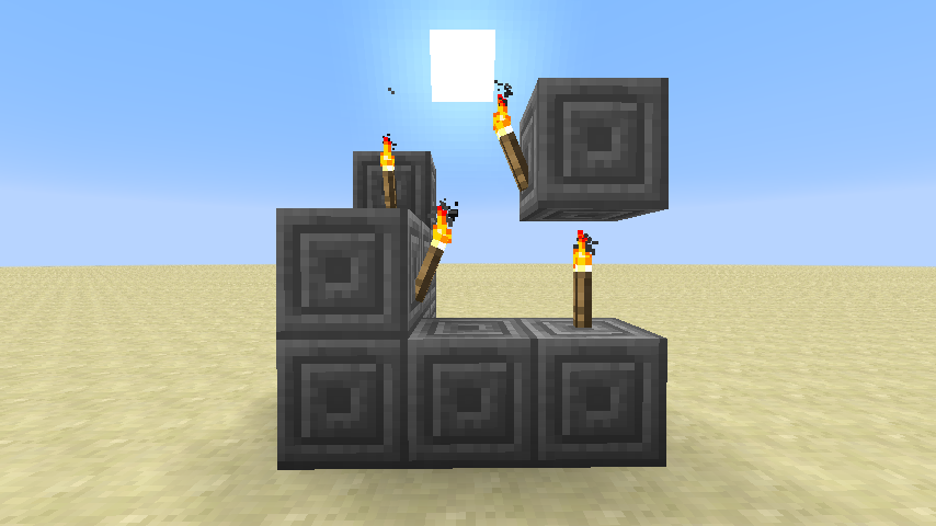 火把可以被放置于大多数固体方块的顶端或侧面,不过有个别的需要潜行(例外情况见放置)。火把为非固体方块,没有碰撞箱。