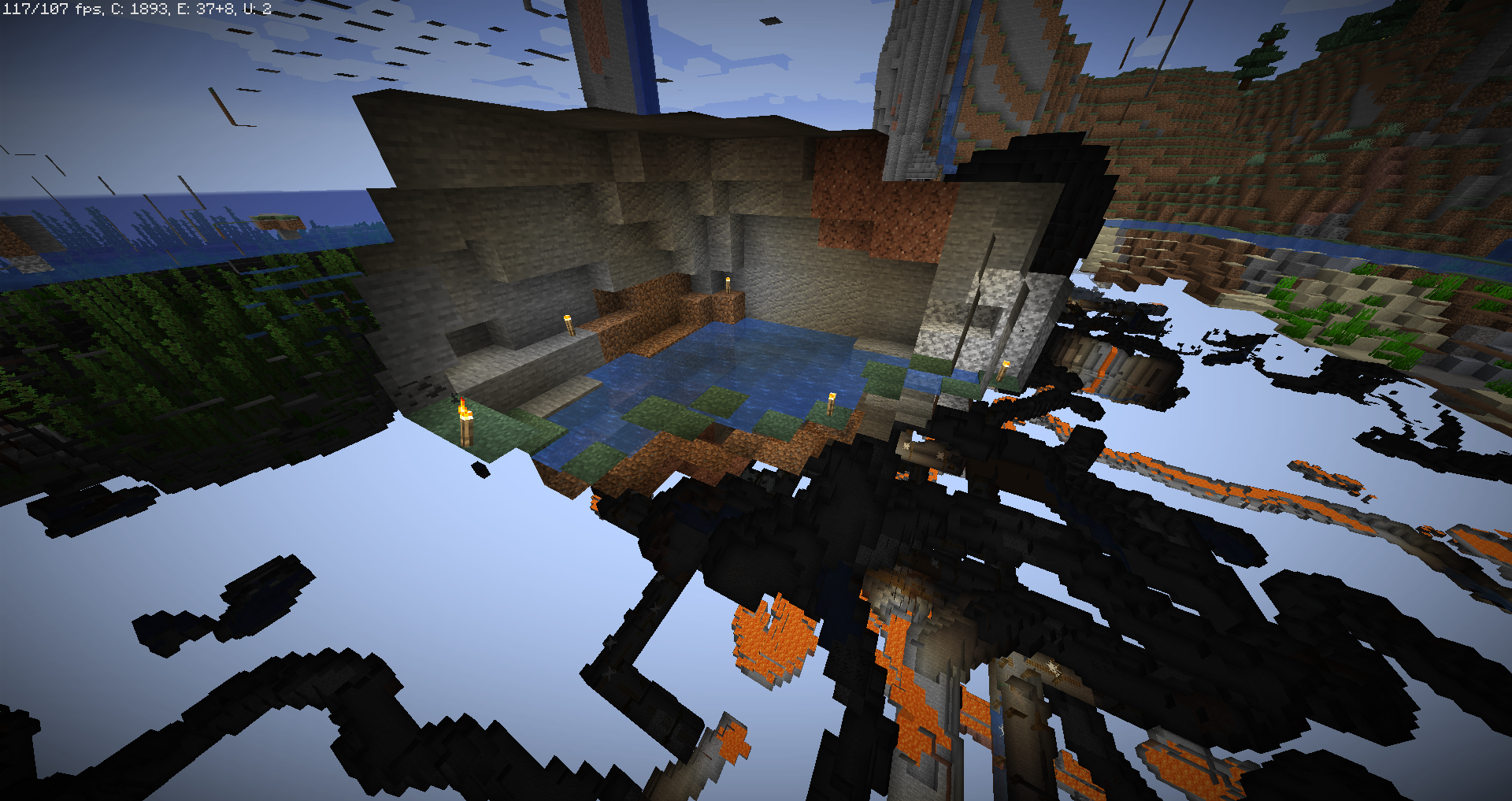 空洞(Hollows)与浮岛相反。 它们看起来像洞穴,但与洞穴生成无关(尽管它们可能与洞穴交叉)。当有许多悬崖时,它们会靠在一起并创造出一个空洞。它们的高度与地形一致,这取决于它们所在的生物群系,而不像洞穴那样。洞穴没有特定的高度。草方块可以在空洞内生成,有趣的是它们可以在没有光的情况下生存。当空洞生成在低于海平面的高度上时,它们会被水填充。空洞在主世界中非常罕见,但在自定义世界中很常见。