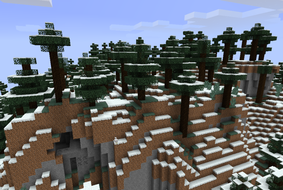 一个多山,遍布云杉的生物群系。草是暗沉的深綠色。这个生物群系会降雪,生成冰和雪。山很常见,狼在这个生物群系也十分容易找到。 |
