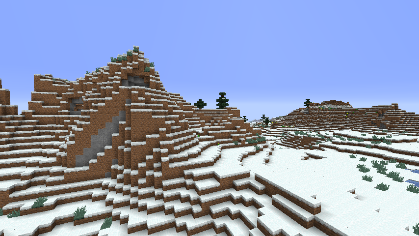 温度:0.2 | 这种生物群系通常在普通山地生物群系的中间被发现,生成更高的山地,因此大部分山地将被雪覆盖。斜坡非常陡峭,这使得攀登这些山地变得困难和危险。山峰的特点是草和云杉树的浓度要高得多,在其顶部会形成一片小森林。 | File:Wooded Mountains.png |