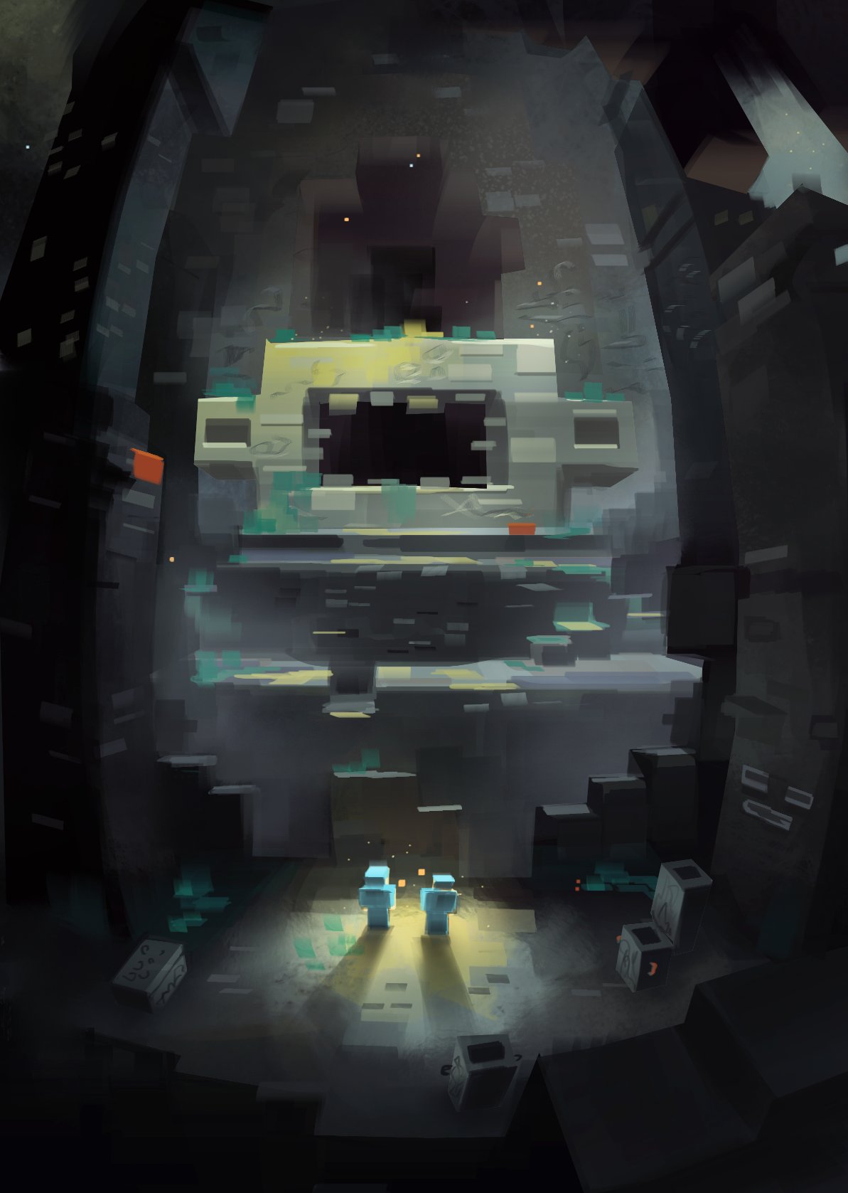 - 結構大體上由灰色系的方塊(如深板岩及其變種、平滑玄武岩、淺灰色羊毛)組成。