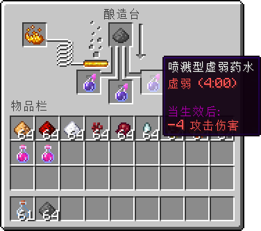 | 虛弱藥水不可以再被用來釀造渾濁的藥水,平凡藥水,基礎藥水,回復藥水,以及力量藥水了。 | |||||