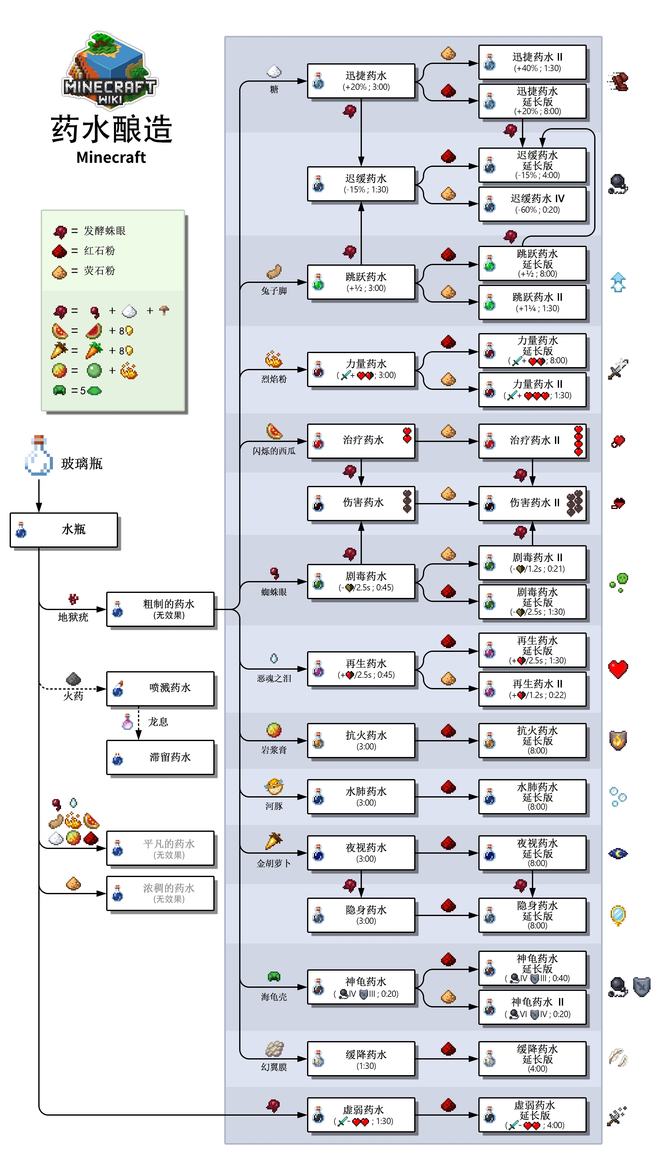 请注意:二级药水的持续时间永远是对应基础药水的一半(Java版剧毒药水除外)所有延长版药水的持续时间都是对应未延长的一级药水的8⁄3