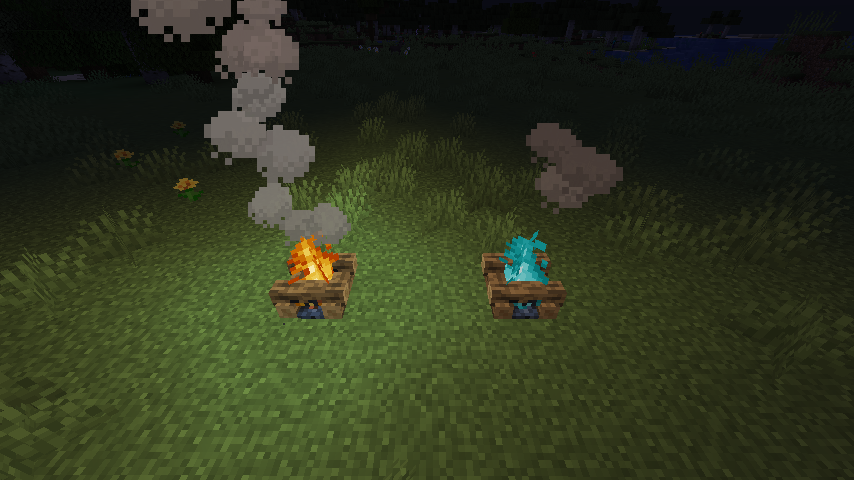 營火產生上飄約10格後消失的煙霧粒子。如果把一個乾草塊放置在營火下方,它將成為一個訊號火,煙霧上飄的高度將會增加至約25格。