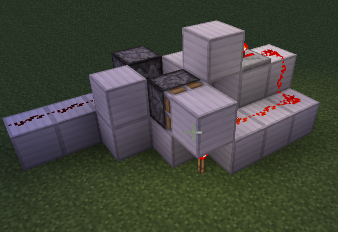 图中拉杆作为D输入端的例子,中间伸出的红石线为时钟触发信号输入(双边沿触发),左侧的红石线为输出端。中间的活板门只是作为BUD触发的辅助物,在Java版1.5失效,应换成活塞、动力铁轨、激活铁轨、音符盒或钟。