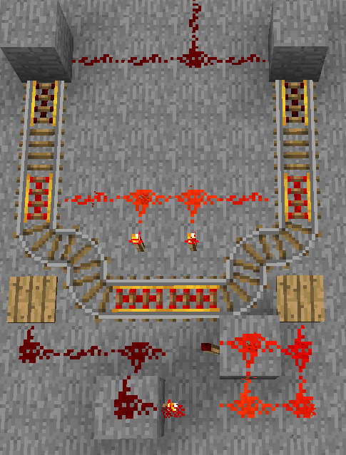 在铁轨拐角处的木质方块为压力板,他们是用来切换底部RS或非锁存器的状态的。