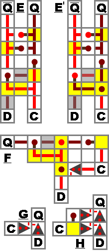 设计方案E就是一个更紧凑版的设计版本A,同时仍具有相同的高度需求。设计方案E'允许边沿触发器在高电平输入时被触发。设计版本F在时钟信号为真时保持状态,时钟信号变为假时输出D的状态。注意图中有一个用于断路的在红石线之上的方块,用黄色斜线表示。中继器在此用来同步信号,为此它必须处于激活状态。