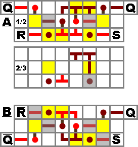 在真值表中,输入端 S 和 R 是禁止同时为真的,因为这就破坏了输出端 Q 与 Q 互反的规则。并且,在一些设计版本(比如B和D)中,输入端信号非隔离于输出端信号,会导致输出信号 Q 和 Q 同时显示为真。只有当 S 或者 R 为假后,输出信号才会重新变为正确值。然而,如果 S 和 R 在同一周期同时变为假,则输出结果将不可预测,可能是 Q,也可能是 Q,取决于游戏的机制。在实际使用中,这种使得输出值无法预测的输入状态应该避免使用。在设计版本E中,如果 S 与 R 同时为真,则 Q 和 Q 同时为假。