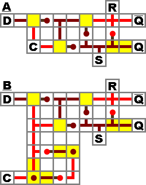 设计方案C就是比设计版本A宽一格,并且用了正相时钟的设计版本。它会在时钟信号为真时持续的设置输出信号。我们可以设计多个这样的触发器,并且并行放置在最小的空间里。一个时钟信号可以分配给所有这些触发器,这样就允许多个触发器共用一个时钟边沿信号。输出端 Q 在反方向上和输入端一道比较容易连接。