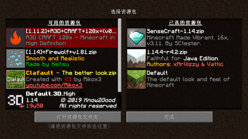 资源包会按照列表上的顺序加载它们的资源。最下面的资源包(总是“默认”的那个)将会首先加载,然后每个资源包会代替上一个相同名称的资源。
