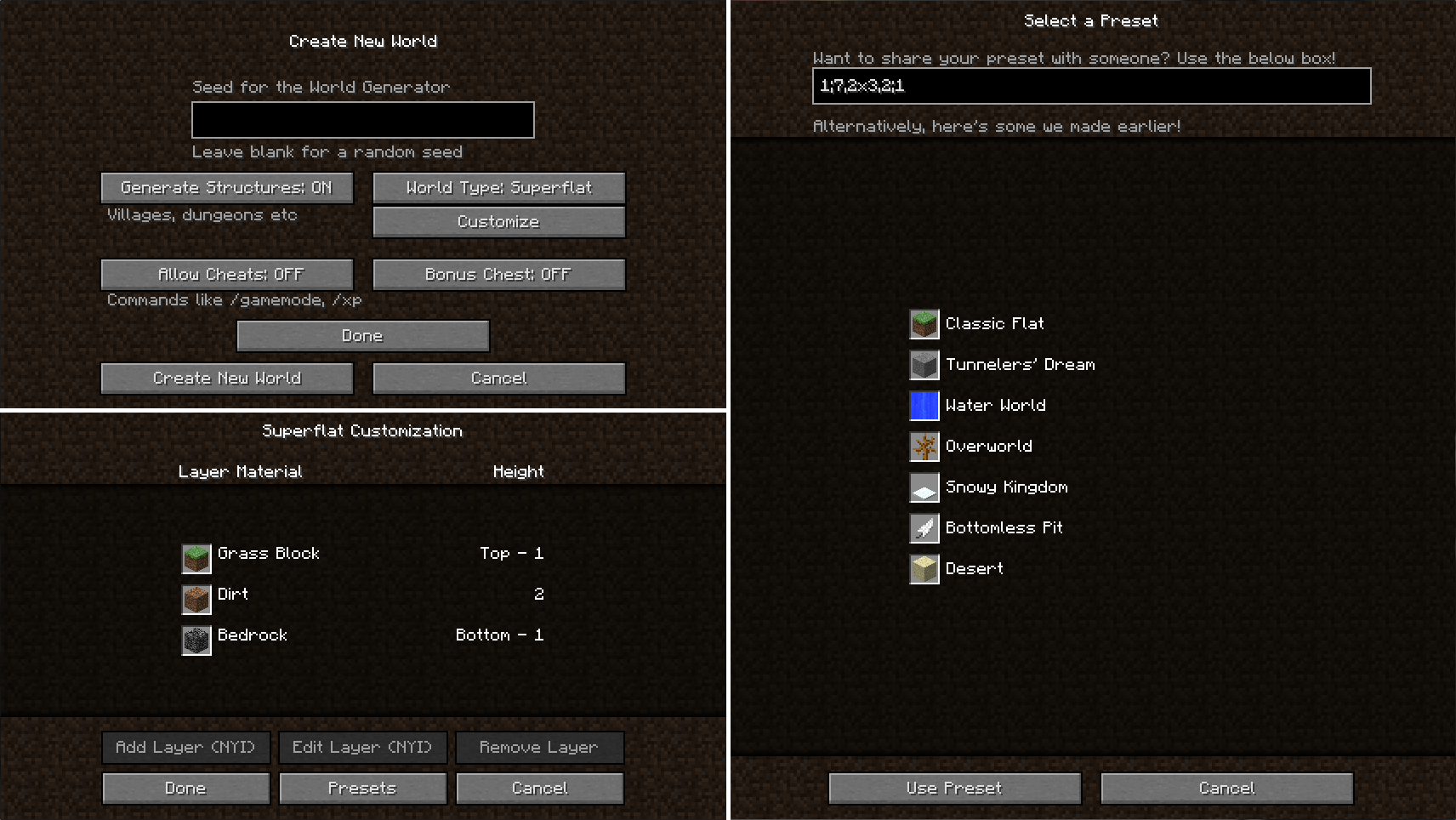 - 如果你将默认世界重命名为与超平坦世界相同的名字,部分区块(有时会是非常大的地区)也许仍会存在超平坦区域,尽管草的颜色会随着生物群系变化而变化。