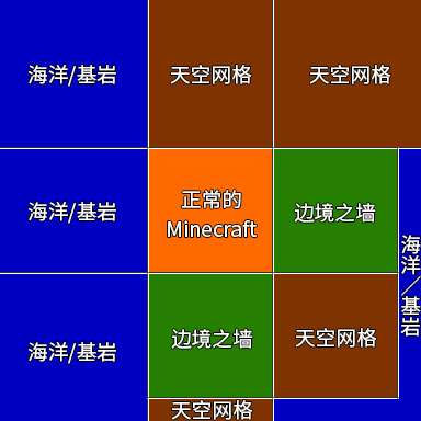 - 到達負方向的邊境之地的唯一途徑是飛行。走到負方向邊境之地是不可能的,因為這時的地形由假區塊組成。
