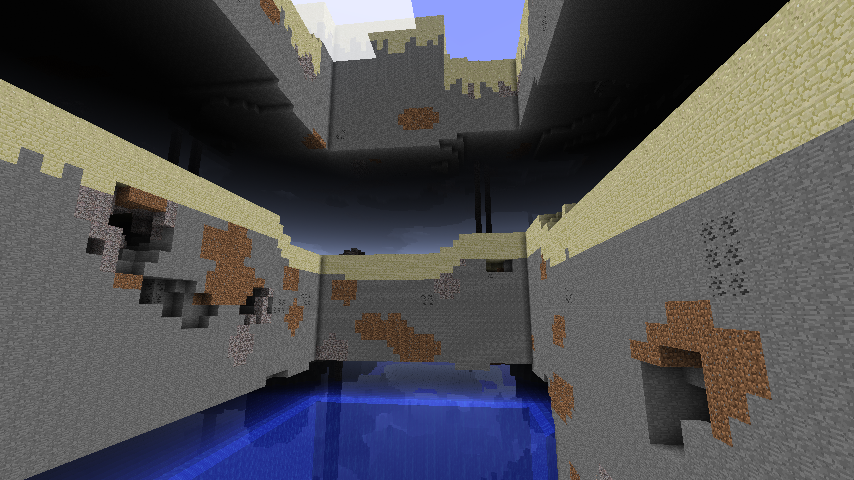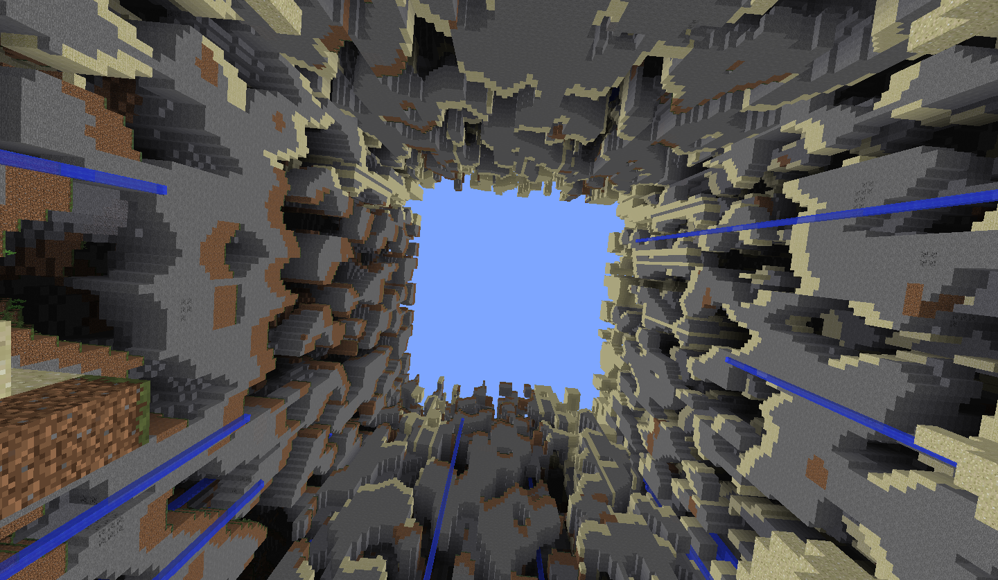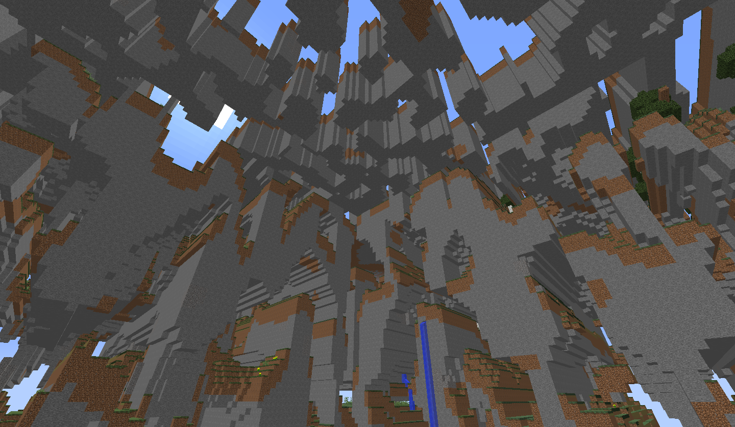 - 最頂層:這一層在世界的最高處。有時候這一層可以矮一些,但陽光可以直射到,且也不會被水掩蓋。因此這一層地形的下陷處會出現樹木和被動型生物。由於地形的較高處幾乎就達到了世界的高度限制,因此很少會出現樹木和動物。
