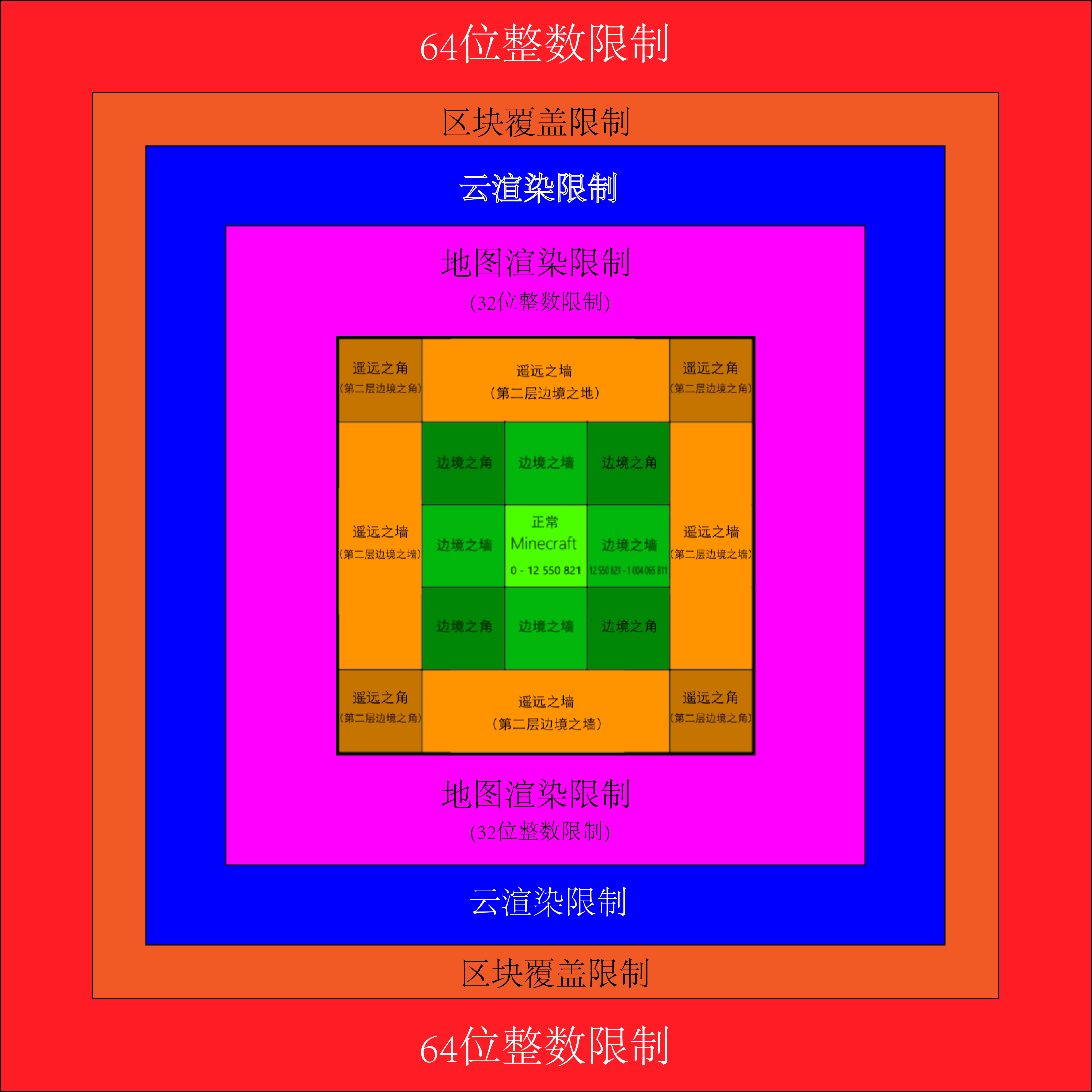 - 在X/Z±2147483519處,世界繪製完全停止工作,在Minecraft中停止地形生成。使用32位元整數會在這個位置溢出導致遊戲崩潰。區塊仍然會生成,但除了空氣沒有其他東西。過了這點地圖會停止生成方塊表面材質。,