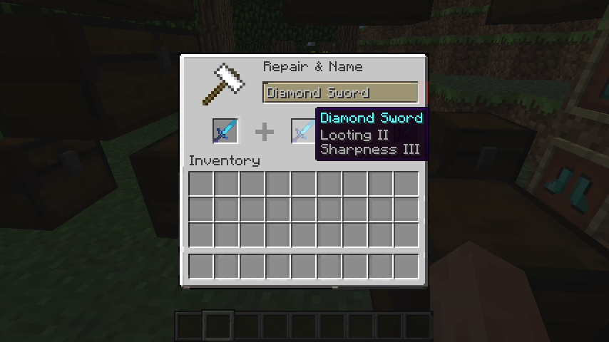3) 当合并附魔时,第一格内(左边)的物品将会保留附魔效果。也就是说当第一格为附有锋利3和抢夺2的剑,第二格为节肢杀手2和抢夺2的剑时,魔咒锋利将会覆盖魔咒节肢杀手,最后的修复结果为附有锋利3和抢夺3的剑。也就是说如果两格物品互换(原处于第一格内的剑放于第二格)最后的结果为附有节肢杀手2和抢夺3的剑。