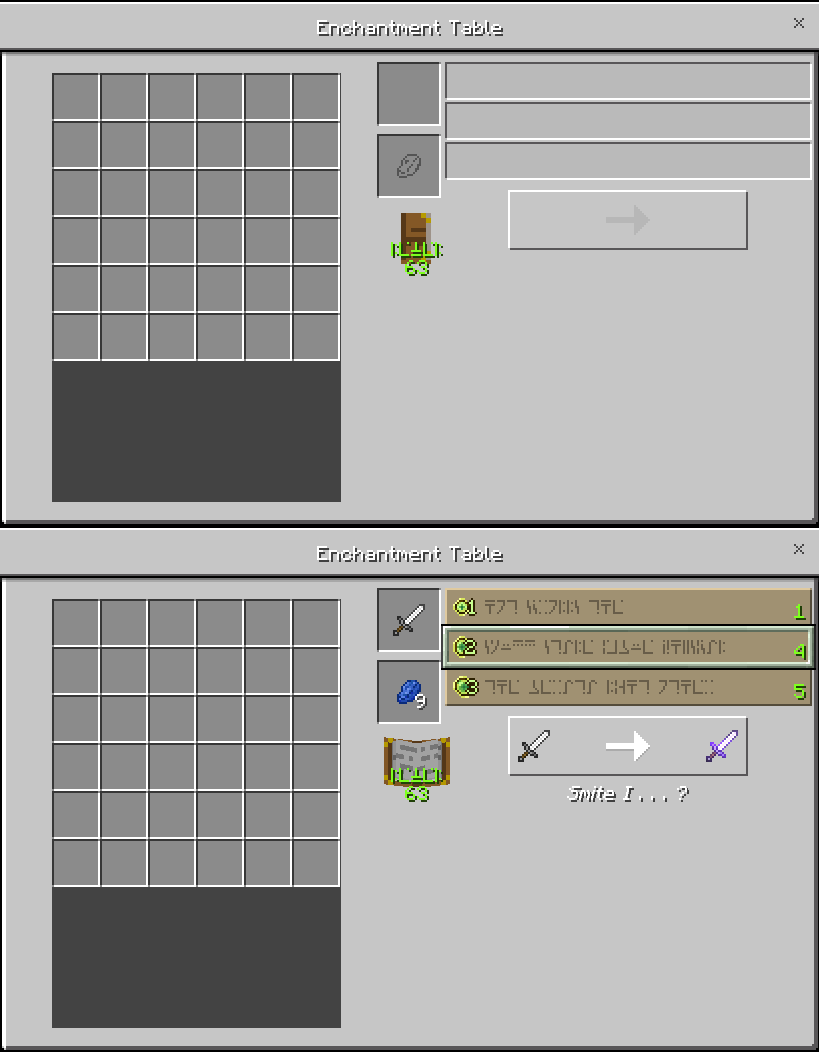 附魔台界面。上:没有物品。下:有物品和可用的魔咒。最后一项魔咒由于青金石不足而不能选择,目前选择了第二项魔咒。