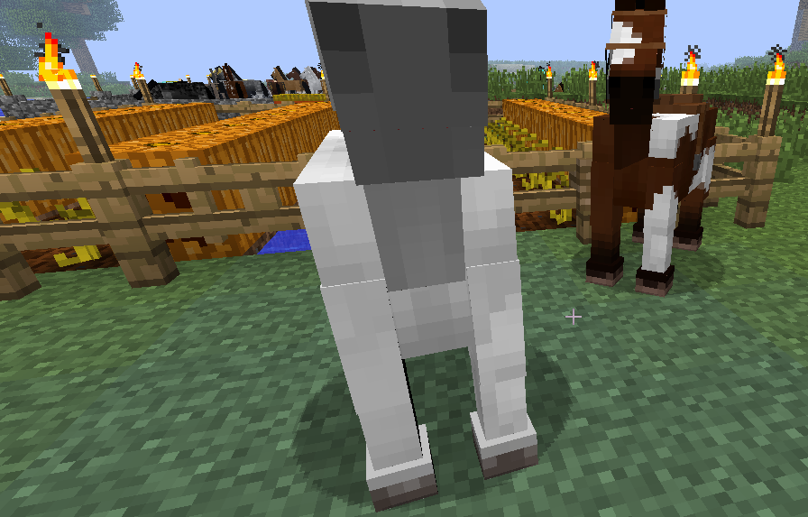 - 马 一个方块样的体形。它们可以拥有1~7种基础底色:白色, 鹿皮色(褐色), 深枣红色, 枣红色,黑色,灰底棕色斑纹,和淡栗色;和1~5种花纹图案:没有花纹,穿袜子(既白色的马蹄)并且脸上有白斑的,雪片样斑点的阿帕卢萨马,斑点与煤灰背脊。在游戏里总计有35种可能出现的马的皮肤的组合。