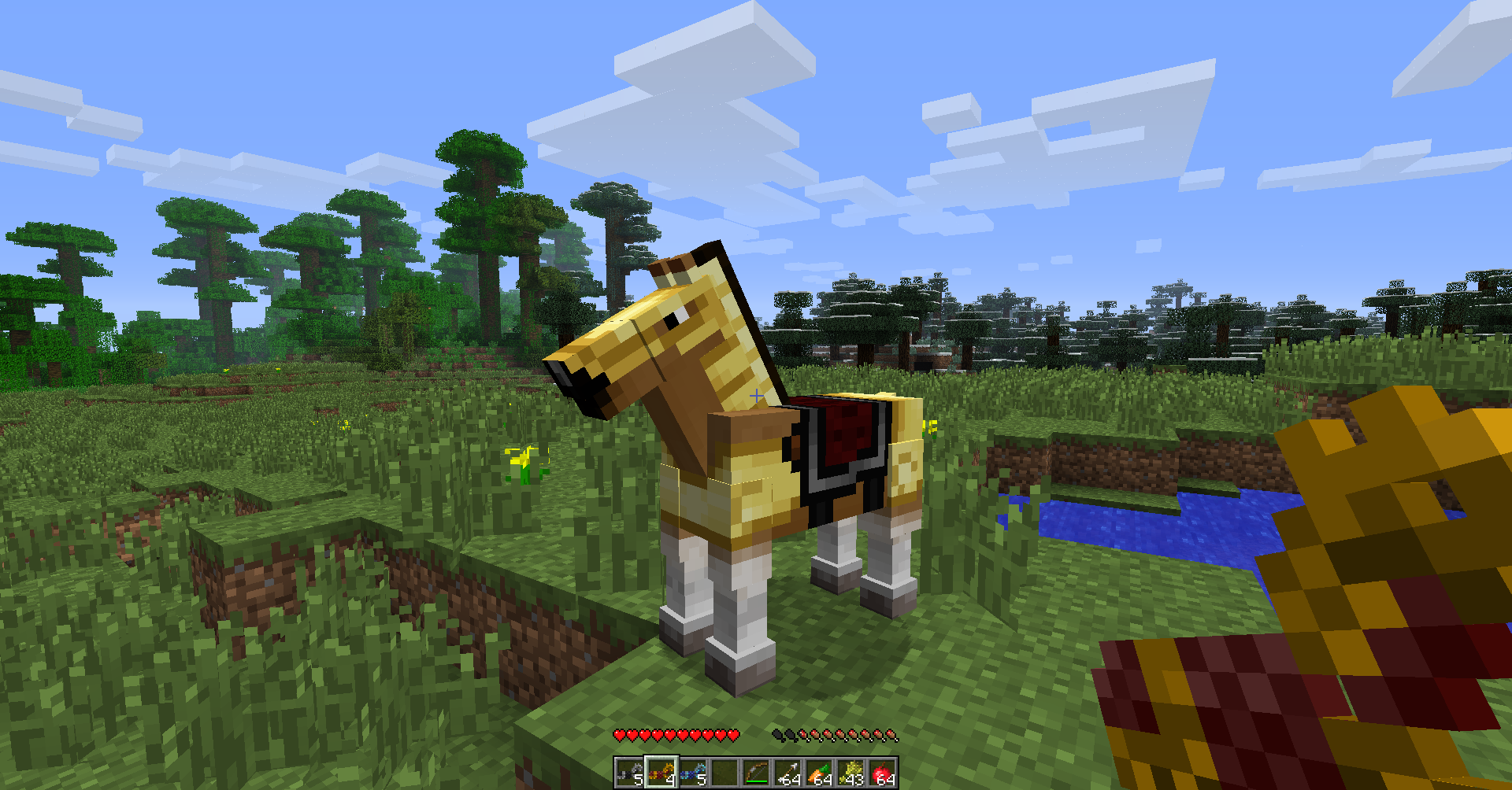 骑马时,饥饿栏与氧气栏被马的生命值栏代替,其材质与玩家的生命值略有不同。经验栏被马的跳跃蓄力栏代替,代表你的马跳跃的高度。要跳到最高跳跃高度,就意味着你在释放空格键之前这个槽要是满的,最高高度取决于你骑着的马。这个高度范围似乎在1.2-5.5方块高之间。每只马的统计都不同,因此很难测出马的准确最高跳跃高度,但有测试透露马可以跳12个方块。