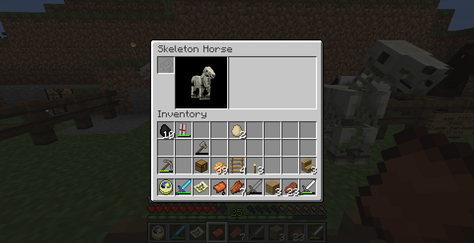 所有的骷髅马都有3种“马匹统计”:生命值、(最大)移动速度和跳跃力量。这些数据是在骷髅马生成后固定不变的。