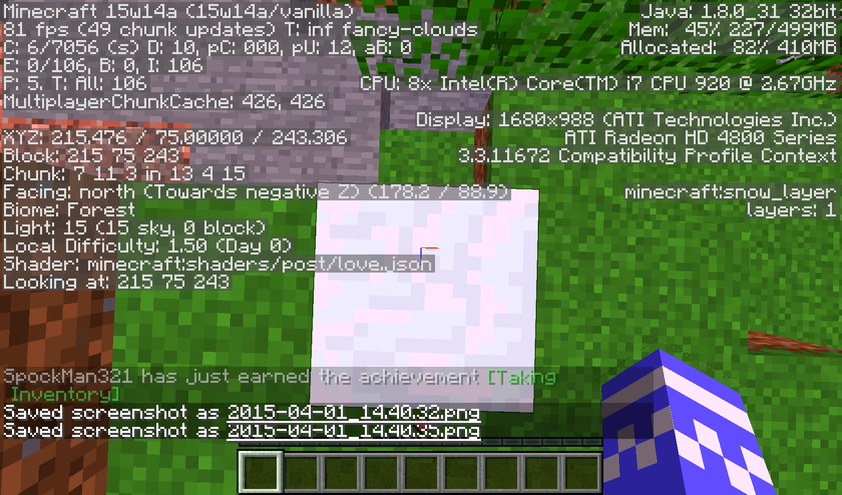 - 在選單熒幕上,唯一的閃爍標語為「Minecraft is love, Minecraft is life」