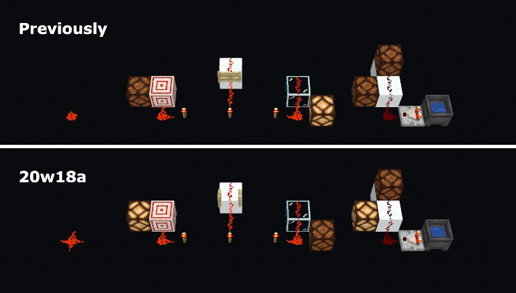 - The blog post for this update includes an image comparing the prior redstone mechanics to the changed mechanics. Previously, the before mechanics were labeled as 1.15.2 mechanics, despite the presence of a target block, which was introduced later than 1.15.2. The image was later changed to correct this.
