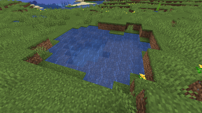 由于水会在Y=63以下的地表生成,它所覆盖的地面可以演变为大型湖泊(Large lake)。大型湖泊的湖底会生成一些沙子和黏土圆盘,但不像河流一样会出现海草。在海岸旁生成的大型湖泊还可能会演变为小海湾。