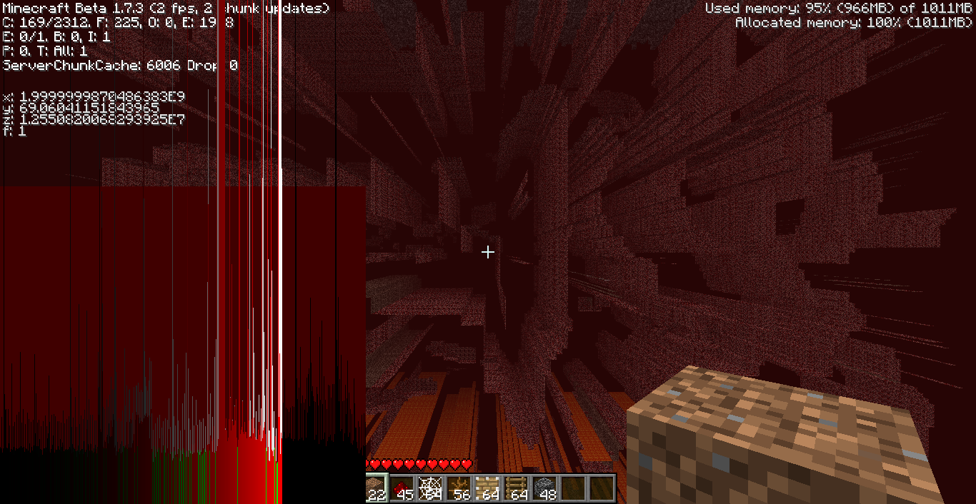 許多現象可以在遠離世界中心數百萬方塊的位置上察覺到。從Infdev 20100624到Beta 1.7.3中第一個顯而易見的現象是跳動式或卡頓的地圖移動。在老版本的Minecraft中,地圖在玩家周圍開始繪製時會繪製出兩個不同的版本,一個繪製方塊本身(實體和所需方塊生成數量)另一個則繪製視覺外觀(比如說碰撞箱、方塊像素等等)。在Java版1.7及更早版本中,世界繪製視覺外觀出現了失去精度的現象,導致了卡頓的移動發生。世界精度丟失的原因是因為遊戲繪製引擎本身使用倍精度浮點數決定玩家周圍的世界位置,但繪製引擎確定玩家移動至周圍的方塊所需的距離時卻使用了單精度浮點數,由於單精度浮點數的精確度只有倍精度浮點數的一半,導致繪製引擎沒有辦法從中得到足夠資訊去正確繪製地形,並且距離翻倍的位置上資訊又會被削減一半。只要移除繪製引擎中的單精度浮點數代碼即可修復這個問題。(事實上,一些精度問題後來得以修復,很大程度上都是繪製引擎中的單精度浮點變數被逐步置換為倍精度型的。)