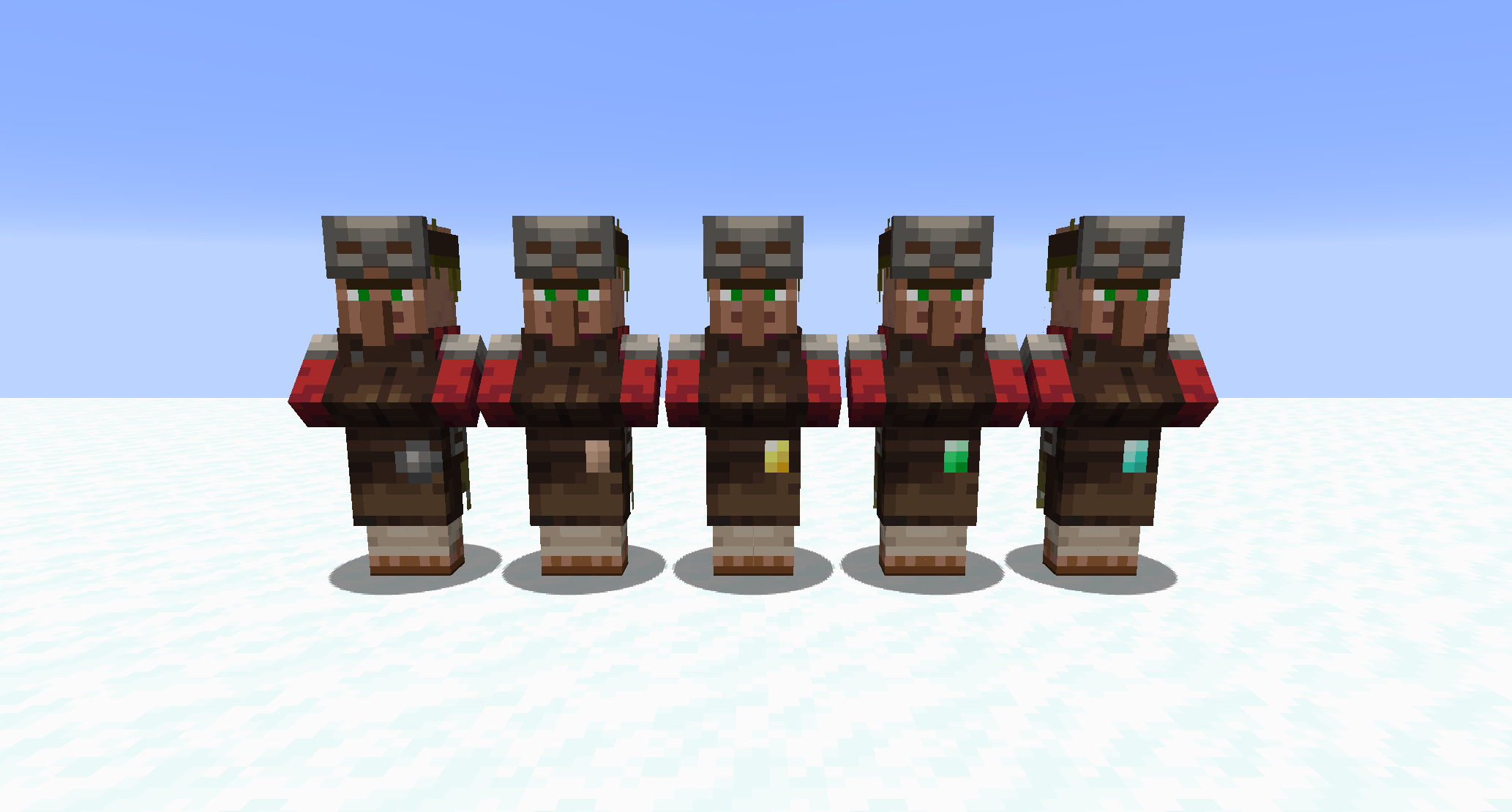 - 村民現在有5個等級,用於展示解鎖了的交易內容層級,體現在村民服裝上的徽章:新手、學徒、老手、專家和大師。