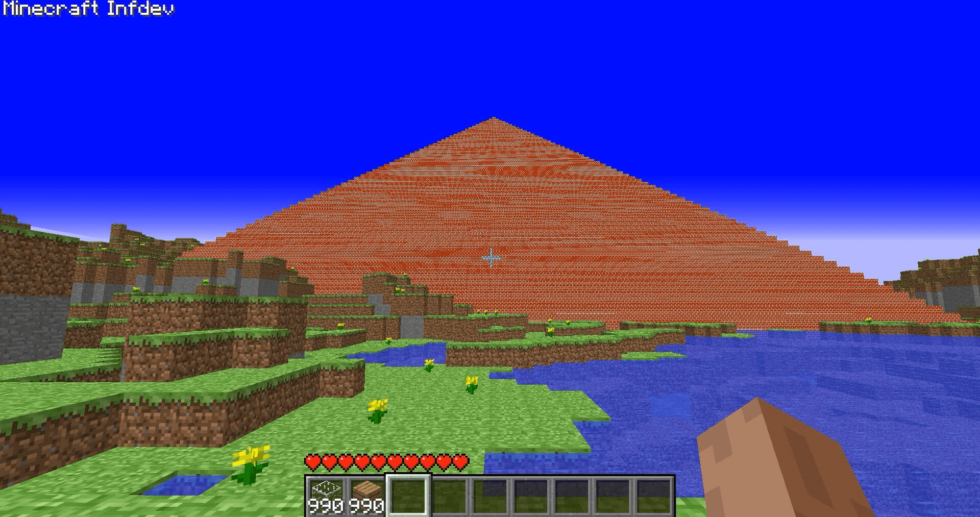 - 巨大的砖块金字塔会非常稀有地在早期版本的Infdev中生成。这些金字塔的高度从地面延伸至接近世界顶部的地方。金字塔的底部不会替换掉除水和空气以外的正常地形。这些金字塔的顶部经常会因超出世界顶部而被移除。这种结构的信息知之甚少,因为它非常古老稀有。这种结构或许是用于测试的。